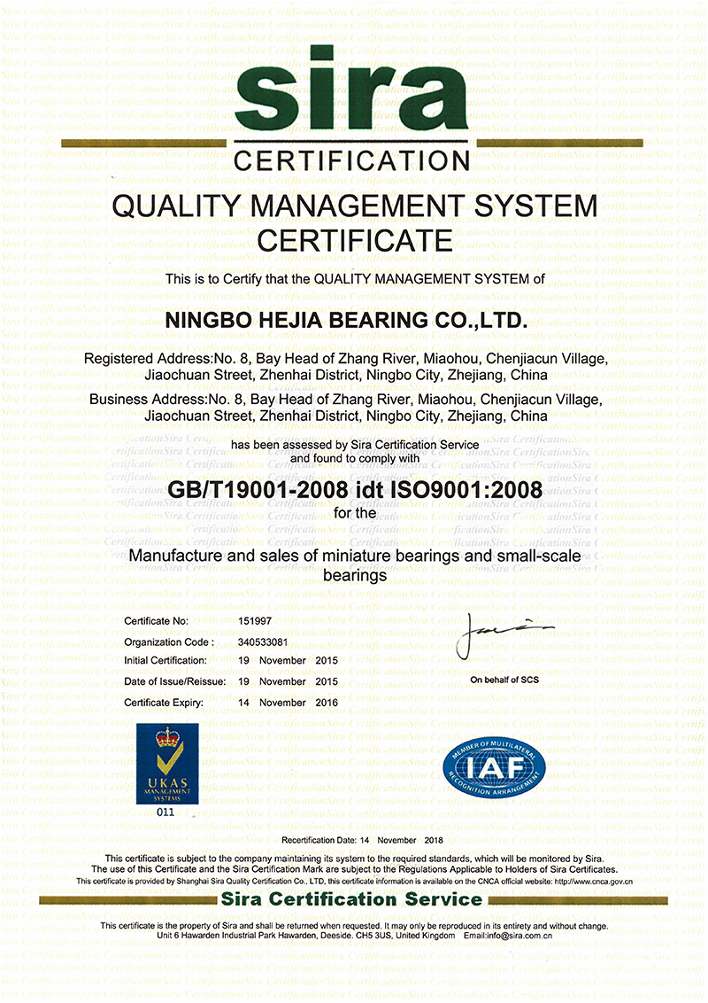 Of:Hejia BearingTime:2015/12/14First warmly congratulated my company adopted the ISO9001:2008 international standard quality system certification.